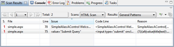 Note: If you do not see the By default, all HTML Rule Sets are configured with a rule in the General Patterns detection category that catches standard HTML tag attributes (you can see the rule's pattern under the Reason column in the screenshot above). These tag attributes are not caught in the Embedded Strings category because they are defined in a completely different fashion. They are embedded within a tag as an attribute instead of delimited between matching tags, as are most HTML strings. Handling attribute strings is not quite as simple as those shown in the Embedded String results. Once you double-click on the row and see the issue displayed in the Source Files view, you will see that the entire input tag is highlighted instead of just the text we want to externalize. This occurs because the pattern necessary to detect it must capture more than just the string. Once you have the input tag highlighted in your source viewer, use your mouse to select only the display text (do not select the double-quotes):