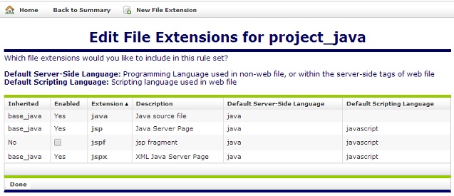 Setting File ExtensionsThe Edit File Extensions list, shown below, allows you to choose the types of files to scan. In other words, when Globalyzer performs a scan, only these types of files are considered. Also note that the scanner only looks for files of these types that lie in the scan source path. The Inherited column lists the name of the Rule Set that defined the file extension. A value of 'No' indicates that the file extension is local to the Rule Set. Local file extensions can be modified and/or deleted. Inherited ones can be overridden. To disable a local file extension, uncheck the box. The file types that are checked are added to the Rule Set. To specify a new file type, select the New File Extension link at the top of the form. This displays the Create File Extension form shown below. The page contains five fields used to describe a file extension: Extension, Description, Default Server-Side Language, Default Scripting Language, and Enabled. Use the Extension field to provide the new file extension (DO NOT enter the dot). Use the Description field to describe the file extension. Default Server-Side Language names the programming language used in a non-web file, or within the server-side tags of a web file. This field may not be necessary for your file extension. Default Scripting Language names the scripting language used in a web file. This field may not be necessary for your file extension. The Enabled field determines whether the file extension is included (checked) in the scan or ignored (unchecked) for now. Once the file extension information is complete, press the Create button for the changes to take effect. The Edit File Extensions list redisplays, showing your changes. If a file extension is local to the Rule Set, it can be modified and/or deleted. Click on its name hyperlink from the Edit File Extensions list. This displays the Edit File Extension page, shown below. All fields are modifiable. Press Update to save any changes. Press Delete to delete the file extension. After updating or deleting, the Edit File Extensions list redisplays, showing your changes. If a file extension is inherited, it can be overridden. Maybe the you want to disable the inherited file extension in your Rule Set. Click on its name hyperlink from the Edit File Extensions list. This displays the Override File Extension page, shown below. All fields are modifiable, but if you change the extension field, you will end up creating an entirely new file extension, rather than overriding the inherited one. Press Create to create the override file extension. After creating, the Edit File Extensions list redisplays, showing your local file extension. To return to the Customize Rule Set page, select the Back to Summary link. |