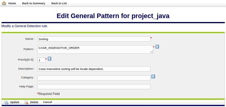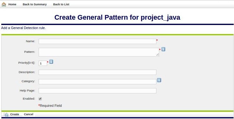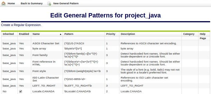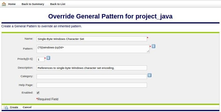 The Edit General Patterns list allows you to specify patterns to include within the code scan: The Inherited column lists the name of the Rule Set that defined the general pattern. A value of 'No' indicates that the general pattern is local to the Rule Set. Local general patterns can be modified and/or deleted. Inherited patterns can be overridden. To disable a local general pattern, uncheck the box. To create a new pattern, select the New General Pattern link at the top of the page. This displays the Create General Pattern form, shown below. The page contains six fields used to describe a rule: Name, Pattern, Priority, Description, Help Page, and Enabled. Use the Name field to give your pattern a brief, meaningful name. The Pattern field must contain a valid Regular Expression. For more information on Regular Expression syntax, click here. The Priority field is used to rank the detected issue. Priorities range between 0 and 5. Assign priority 0 to indicate a string concatenation. Otherwise, assign priority 1 to 5, with 1 being the most likely to be an issue. Note that the string concatenation priority 0 will display as a 'C' in the Globalyzer Workbench. Use the Description field to (1) enter a more indepth explanation of the pattern, (2) understand the reason for its inclusion in the scan, and/or (3) describe a process to correct the problem. Use the Category field to set a category that can be enabled or disabled in bulk for a ruleset. The Help Page field is where you can provide a URL link for the general pattern. This link may either help explain why this general pattern is important, or it may explain how to correct the issue found. The Enabled field determines whether the general pattern is processed by Globalyzer (checked) or ignored by Globalyzer for now (unchecked). Once you've provided the general pattern information, click the Create button. The Edit General Patterns list redisplays, showing your changes. If a general pattern is local to the Rule Set, it can be modified and/or deleted. Click on its name hyperlink from the Edit General Patterns list. This displays the Edit General Pattern page, shown below. All fields are modifiable. Press Update to save any changes. Press Delete to delete the general pattern. After updating or deleting, the Edit General Patterns list redisplays, showing your changes. If a general pattern is inherited, it can be overridden. Maybe you want to disable the inherited pattern in your Rule Set. Click on its name hyperlink from the Edit General Patterns list. This displays the Override General Pattern page, shown below. All fields are modifiable, but if you change the pattern field, you will end up creating an entirely new general pattern, rather than overriding the inherited one. Press Create to create the override general pattern. After creating, the Edit General Patterns list redisplays, showing your local general pattern. To return to the Customize Rule Set page, select the Back to Summary link. |