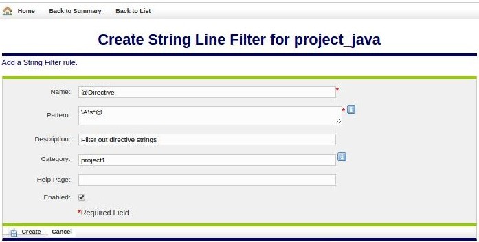 To create a new filter, select the New String Line Filter link at the top of the page. This displays the Create String Line Filter form, shown below.