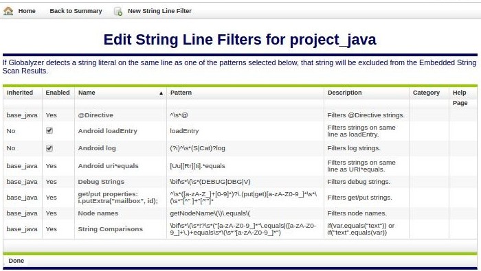 String Line Filters provide a way to filter strings from the embedded strings errors reports based on patterns that are detected in the line of code that the string is found. Specifically, these filter rules tell Globalyzer that if an embedded string is detected in a line of code that contains one of the selected regular expressions, then ignore it; it doesn't need to be externalized so it shouldn't be listed as an error in the Results Table or summary reports.