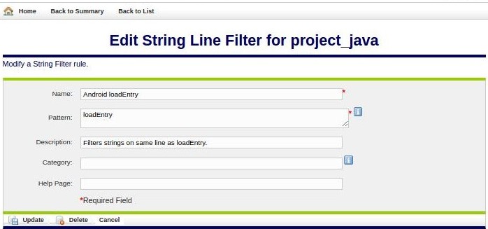 If a string line filter is local to the Rule Set, it can be modified and/or deleted. Click on its name hyperlink from the Edit String Line Filters list. This displays the Edit String Line Filter page, shown below. All fields are modifiable. Press Update to save any changes. Press Delete to delete the string line filter. After updating or deleting, the Edit String Line Filters list redisplays, showing your changes.