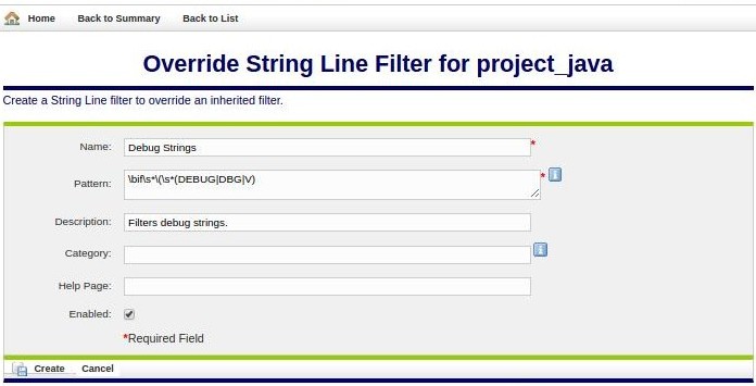 If a string line filter is inherited, it can be overridden. Maybe you want to disable the inherited filter in your Rule Set. Click on its name hyperlink from the Edit String Line Filters list. This displays the Override String Line Filter page, shown below. All fields are modifiable, but if you change the pattern field, you will end up creating an entirely new filter, rather than overriding the inherited one. Press Create to create the override string line filter. After creating, the Edit String Line Filters list redisplays, showing your local filter.
