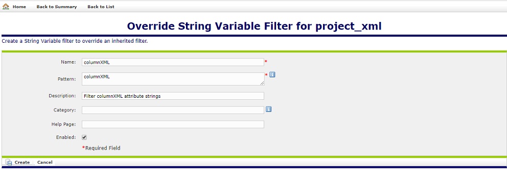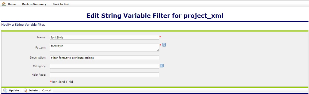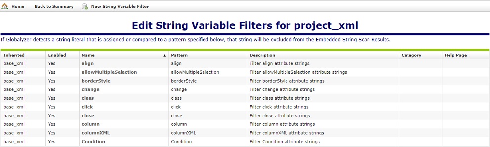 Filtering Embedded String Issues via Variable NamesString Variable Filters provides another means of filtering certain strings from the embedded strings errors reports. Instead of filtering them based upon patterns they contain, this category filters strings from the report based on comparison/assignment to variable names. Your code likely contains strings that are compared or assigned to variables that you know will never be displayed to an end user. For example, in XML there are attribute strings, such as column="status". If you configure column as a String Variable Filter, the string "status" will be filtered. The Edit String Variable Filters list for an XML Rule Set is shown below. The Inherited column lists the name of the Rule Set that defined the string variable filter. A value of 'No' indicates that the filter is local to the Rule Set. Local filters can be modified and/or deleted. Inherited filters can be overridden. To disable a local string variable filter, uncheck the box. To create a filter, select the New String Variable Filter link at the top of the page. This displays the Create String Variable Filter form, shown below. The page contains six fields used to describe a rule: Name, Pattern, Description, Category, Help Page, and Enabled. Use the Name field to give your filter a brief, meaningful name. The Pattern field must contain a valid Regular Expression. For more information on Regular Expression syntax, click here. Use the Description field to explain why this string can be filtered. Use the Category field to set a category that can be enabled or disabled in bulk for a ruleset. The Help Page field is where you can provide a URL link for the filter. This link may provide more information on the filter. The Enabled field determines whether the filter is processed by Globalyzer (checked) or ignored by Globalyzer for now (unchecked). Once you've provided the string variable filter information, click the Create button. The Edit String Variable Filters list redisplays, showing your changes. If a string variable filter is local to the Rule Set, it can be modified and/or deleted. Click on its name hyperlink from the Edit String Variable Filters list. This displays the Edit String Variable Filter page, shown below. All fields are modifiable. Press Update to save any changes. Press Delete to delete the filter. After updating or deleting, the Edit String Variable Filters list redisplays, showing your changes. If a string variable filter is inherited, it can be overridden. Maybe you want to disable the inherited filter in your Rule Set. Click on its name hyperlink from the Edit String Variable Filters list. This displays the Override String Variable Filter page, shown below. All fields are modifiable, but if you change the pattern field, you will end up creating an entirely new filter, rather than overriding the inherited one. Press Create to create the override string variable filter. After creating, the Edit String Variable Filters list redisplays, showing your local filter. To return to the Customize Rule Set page, select the Back to Summary link. Not Supported: Globalyzer does not support this category of filtering for HTML, since HTML only finds strings within tags. |