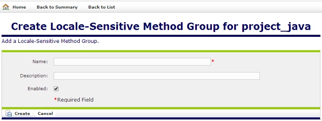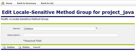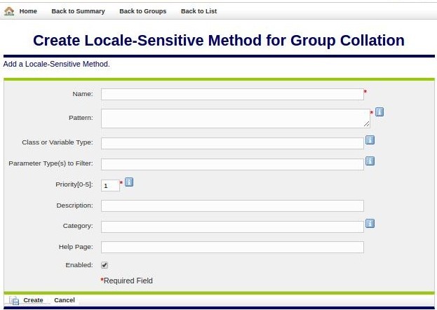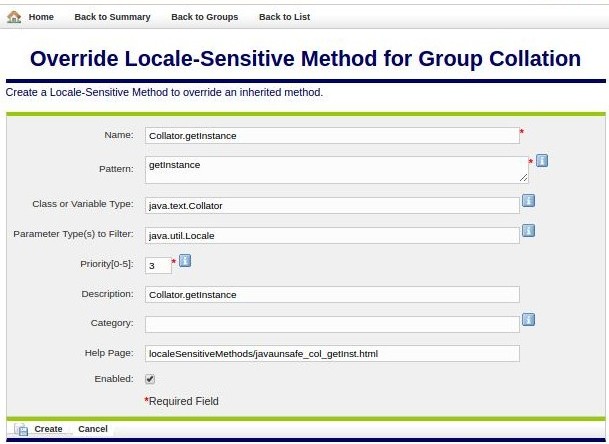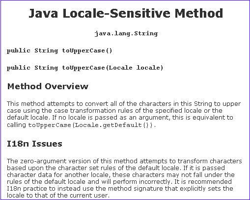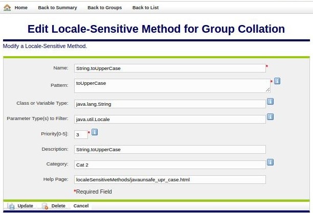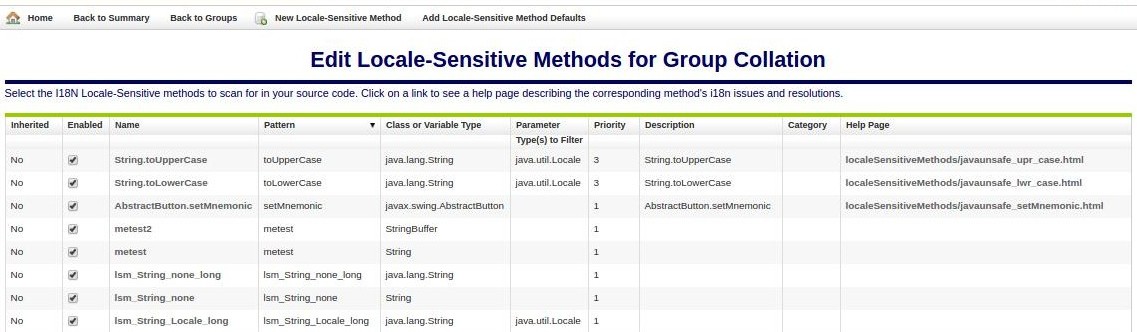 Configuring Locale-Sensitive MethodsGlobalyzer can scan source code files to locate locale-sensitive methods. For more information on locale-sensitive methods, click here. Locale-sensitive methods are organized into groups, as shown below for a java rule set. New groups may be created. If the group is local to the Rule Set, it can be enabled/disabled, deleted, and modified. Enabling/disabling groups enables/disables all the local methods within the group. Only enabled methods are scanned for within source files. The Inherited column lists the name of the Rule Set that defined the group. A value of 'No' indicates that the group is local to the Rule Set. Local groups can be modified and/or deleted. Inherited groups can be overridden by creating a new group with the same group name. To disable a local group, uncheck the box. To create a new group, select New Locale-Sensitive Method Group at the top of the page. This displays the Create Locale-Sensitive Method Group form, shown below. The page contains three fields used to describe a group: Name, Description, and Enabled. Use the Name field to give your group a brief, meaningful name. Use the Description field to describe the group. The Enabled field determines whether the methods within the group are processed by Globalyzer (checked) or ignored by Globalyzer for now (unchecked). Once you've provided the group information, click the Create button. The Edit Locale-Sensitive Method Groups list redisplays, showing your changes. You can only modify or delete a local group. Click on its name hyperlink from the Edit Locale-Sensitive Method Groups list. This displays the Edit Locale-Sensitive Methods list, shown below. Select either Edit Group or Delete Group at the bottom of the page. Note, if the group is inherited, the Edit Group button and the Delete group button will not be available. Selecting Edit Group displays the page shown below. All fields are modifiable. Press Update to save any changes. After editing or deleting a group, the Edit Locale-Sensitive Method Groups list redisplays, showing your changes. Selecting the group Collation from the Edit Locale-Sensitive Method Groups list displays all the methods within the Collation group, as shown below. From here, methods can be enabled/disabled (if local), new methods can be added, and existing method information can be modified (if local). The Inherited column lists the name of the Rule Set that defined the locale-sensitive method. A value of 'No' indicates that the method is local to the Rule Set. Local methods can be modified and/or deleted. Inherited methods can be overridden. To disable a local method, uncheck the box. To understand why a method is considered "locale-sensitive" in an internalized application, and what you'll need to do to ensure that it is being called properly, click on the help link for the method. Globalyzer displays custom i18n help. For example, here is an excerpt from the help for Java's String.toUpperCase() method: