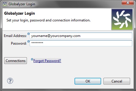 The first time you start Globalyzer, you are asked to provide login information. This information is used the next time Globalyzer is launched. If you would like to change users or connect to a different server, select Window=>Preferences=>Globalyzer=>Login and Server/Proxy Settings sections, make modifications and Apply.