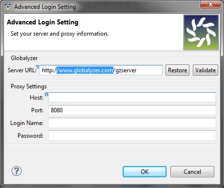 5. If you are connecting to a Globalyzer Server running within your company's intranet, it is unlikely that you will need to set the proxy server settings, in which case you can leave them blank and can now click OK in the Login Connections dialog. If you do need to set proxy server information, see the next step.