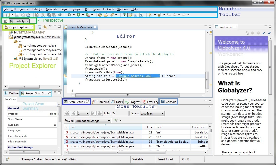 When you start Globalyzer, the application window appears, as shown below. The main parts of the interface are labeled, and briefly described below.