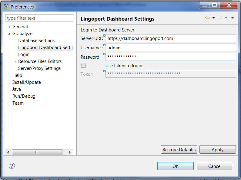 Specify the Server URL and then login information either setting Username/Password or using a token. If you want to login with a token, check "Use token to login". Click the Apply button to apply your settings and the Globalyzer Workbench will try to establish a connection to the Lingoport Dashboard with your settings.